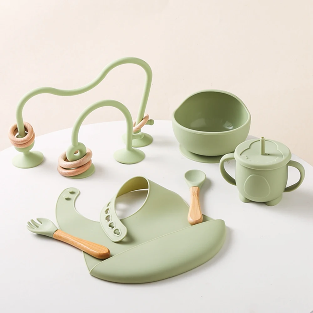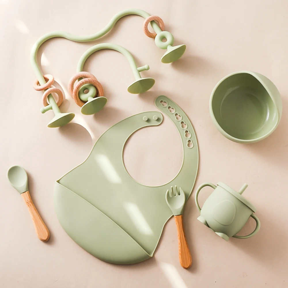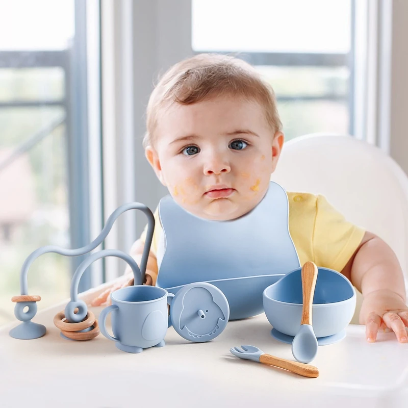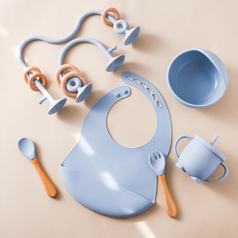 Baby Silicone Tableware Set BPA Free Silicone Non-Slip Feeding Bowl Cup Bibs Wooden Handle Spoon Fork Newborn Feeding Dishes Set