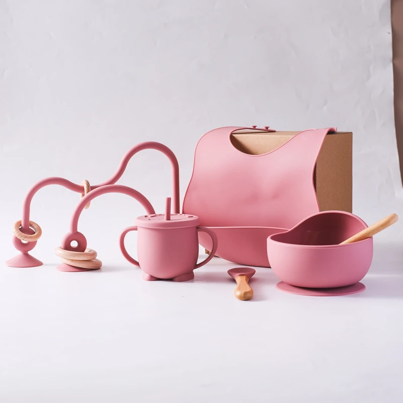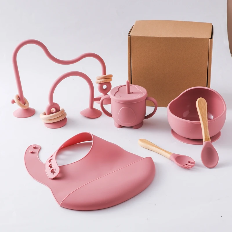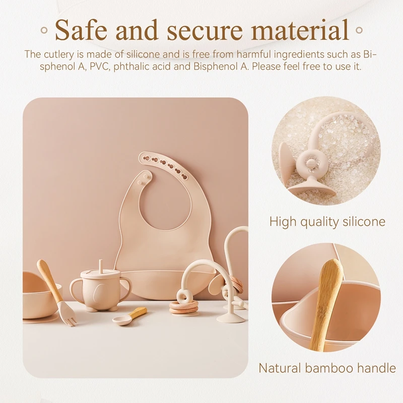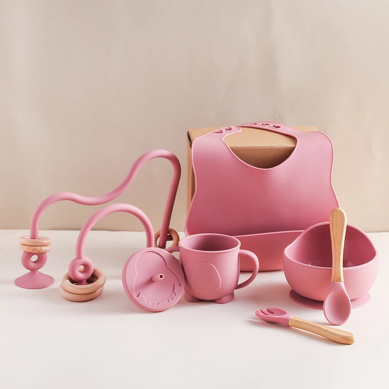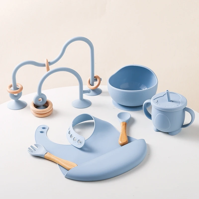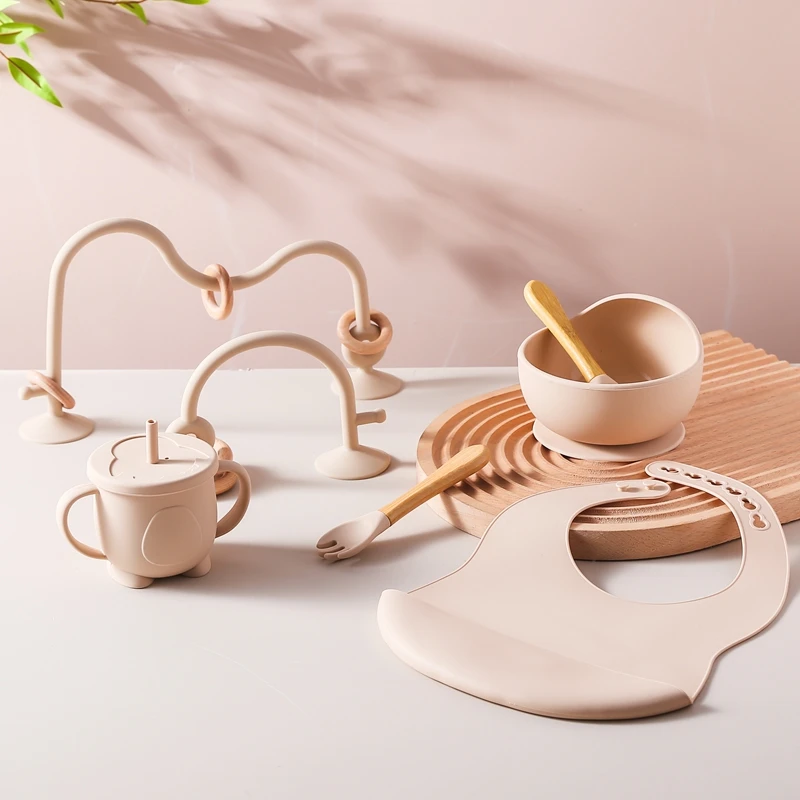 Baby Silicone Tableware Set BPA Free Silicone Non-Slip Feeding Bowl Cup Bibs Wooden Handle Spoon Fork Newborn Feeding Dishes Set