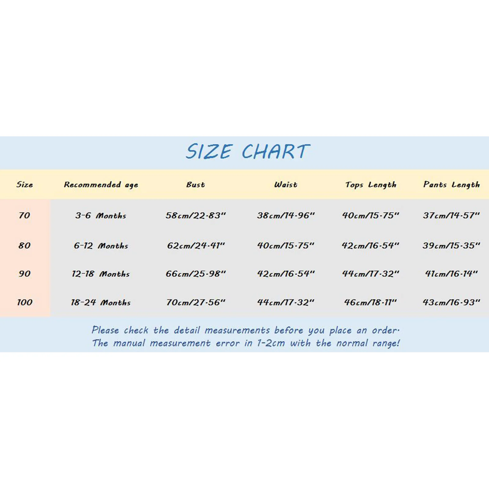 | Size:100 | Recommended age:18-24 Months | Bust:70cm/27.56” | Waist:44cm/17.32” | Tops Length:46cm/18.11” | Pants Length:43cm/16.93” |