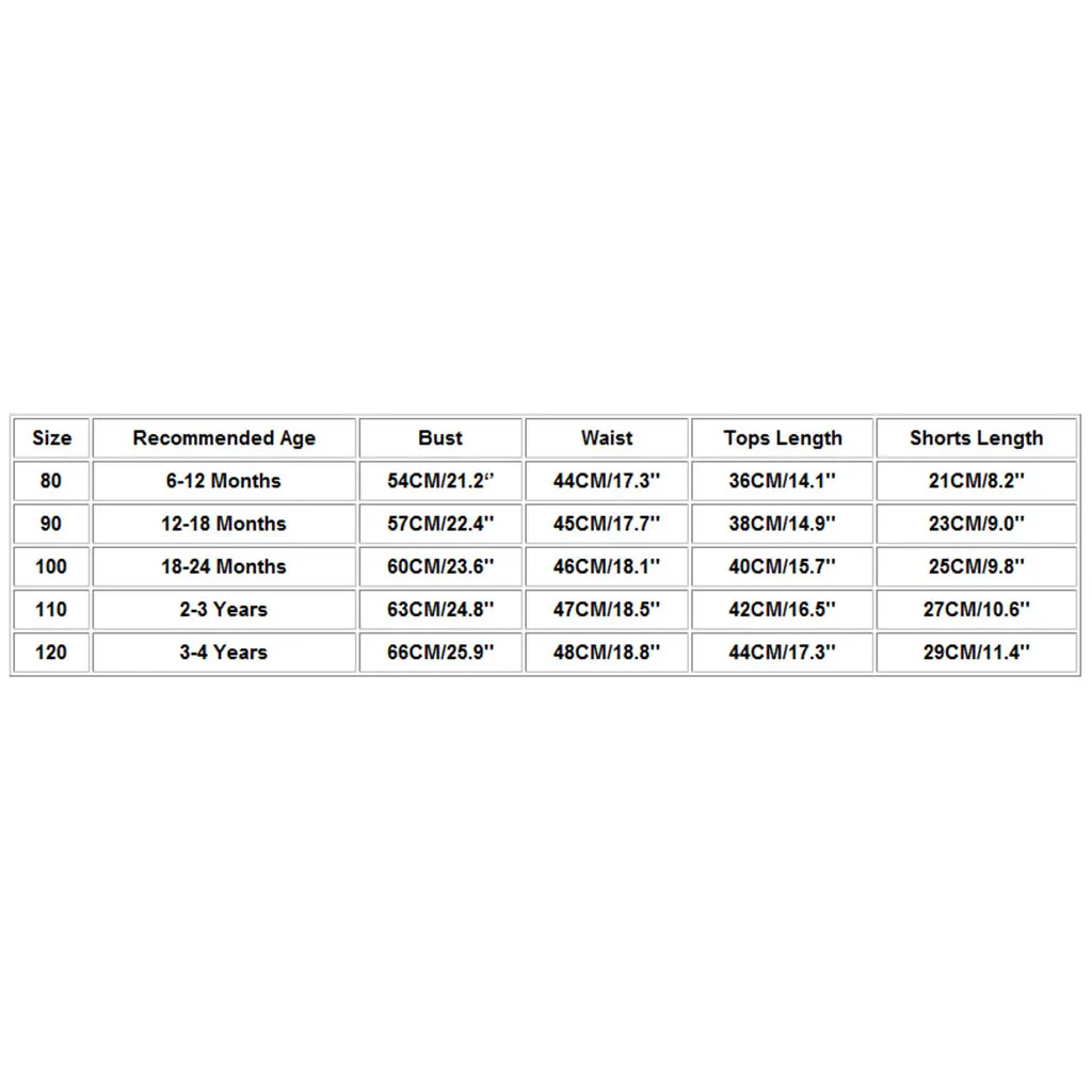 | Size:100 | Recommended Age:18-24 Months | Bust:60CM/23.6” | Waist:46CM/18.1” | Tops Length:40CM/15.7” | Shorts Length:25CM/9.8” |
